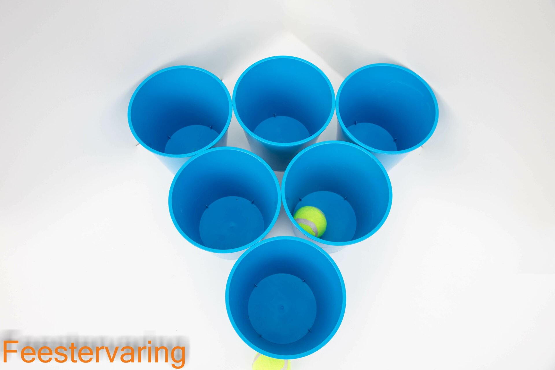 Spel bevat 6 rode en 6 blauwe emmers met 2 tennisballen