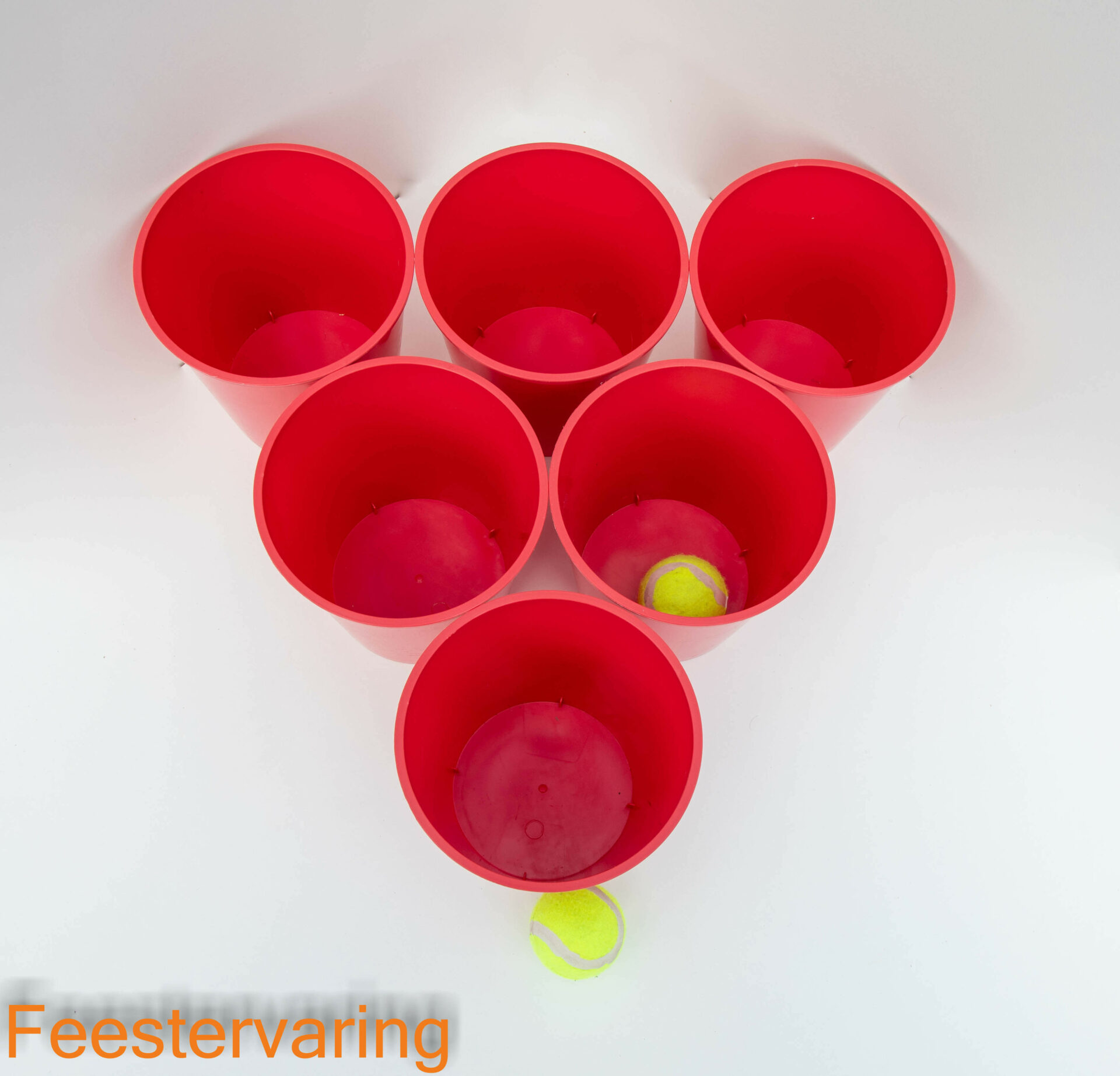 De XL-versie van het bekende drankspel beerpong. Dit spel heet bucketpong! In de emmers doe je geen bier, maar water.In plaats van te drinken als de bal in de emmer terecht komt, moet je de emmer met water over je hoofd gieten. Lekker verfrissend op warme dagen!